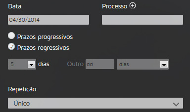• Contagem regressiva: regista o fim ou o início do prazo contado por antecedência relativamente a um determinado evento (exemplos: até 20 dias antes da audiência de julgamento; até 90 dias antes do termo do contrato; a partir do 30.º dia anterior ao termo do contrato).